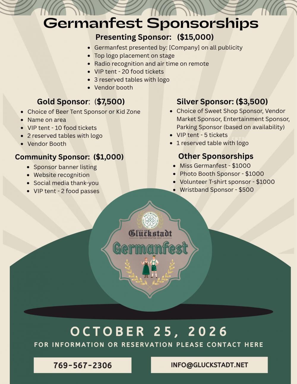 Sponsoring GermanFest is more than putting your name on a banner, it is an opportunity to invest in one of Gluckstadt’s most beloved traditions, support community events that bring families together, and show your commitment to the continued growth and success of our city.