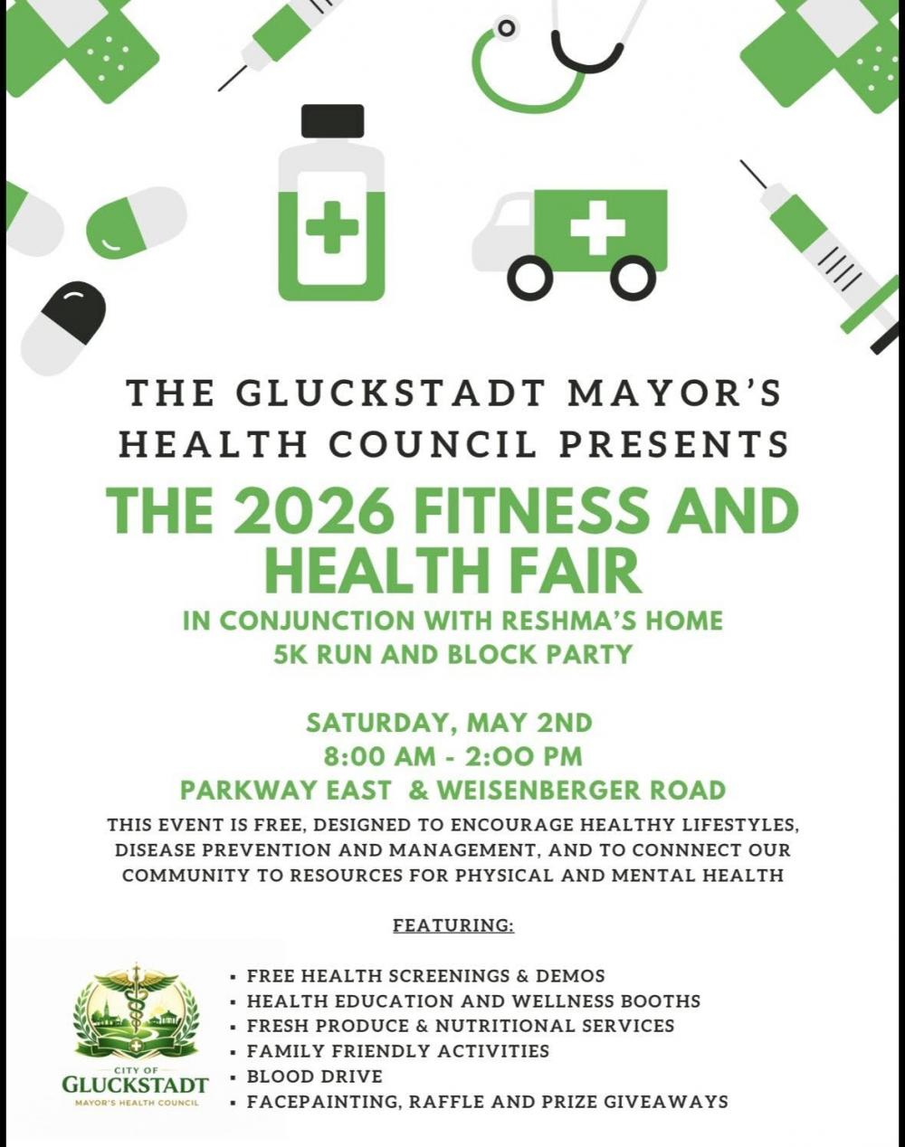 The City of Gluckstadt Mayor’s Health Council, in partnership with local community health organizations, is proud to announce the 2026 Fitness & Health Fair taking place Saturday, May 2nd from 8:00 AM – 2:00 PM at Weisenberger Road & Parkway East.